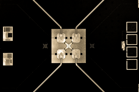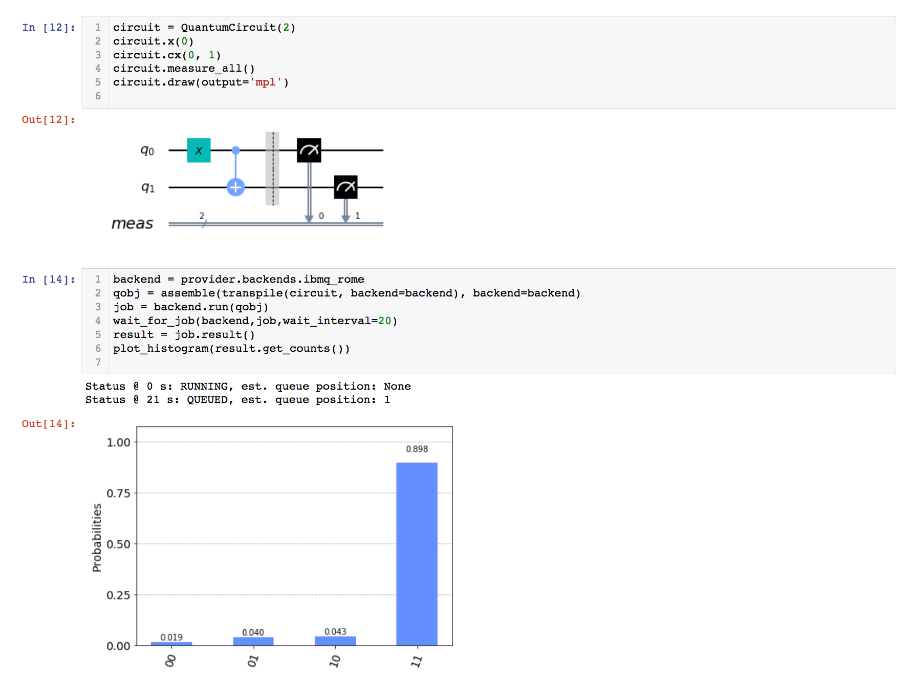 The experiment has q0 inverted from ∣0❭ to ∣1❭. If an X was applied to q1 so it entered the CNOT as ∣1❭ it would be inverted by the CNOT to ∣0❭. We did not show this case for q1 as the formation of the Bell state will have q1= ∣0❭.