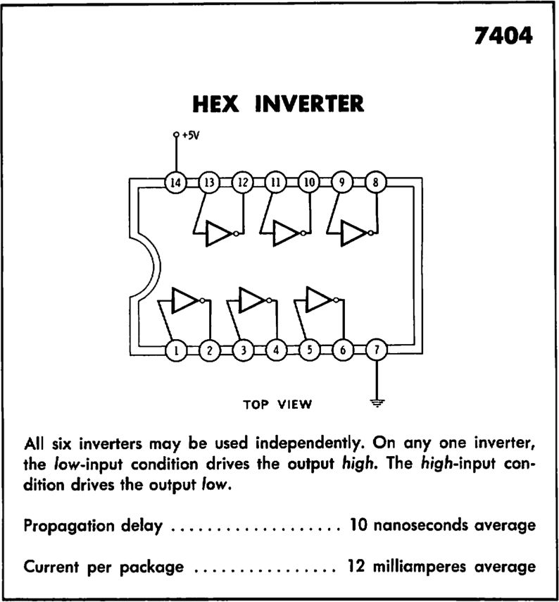 For qubits in the states ∣0❭ or ∣1❭, the Pauli X operator swaps their state. This is like a classical NOT gate in digital logic design. See the sidebar for the classical TTL 7404 quad inverter, and refer to the equally classic as the state Don Lancaster's TTL Cookbook for all you would like to know about classic digital logic with the 7400-series TTL logic gates.