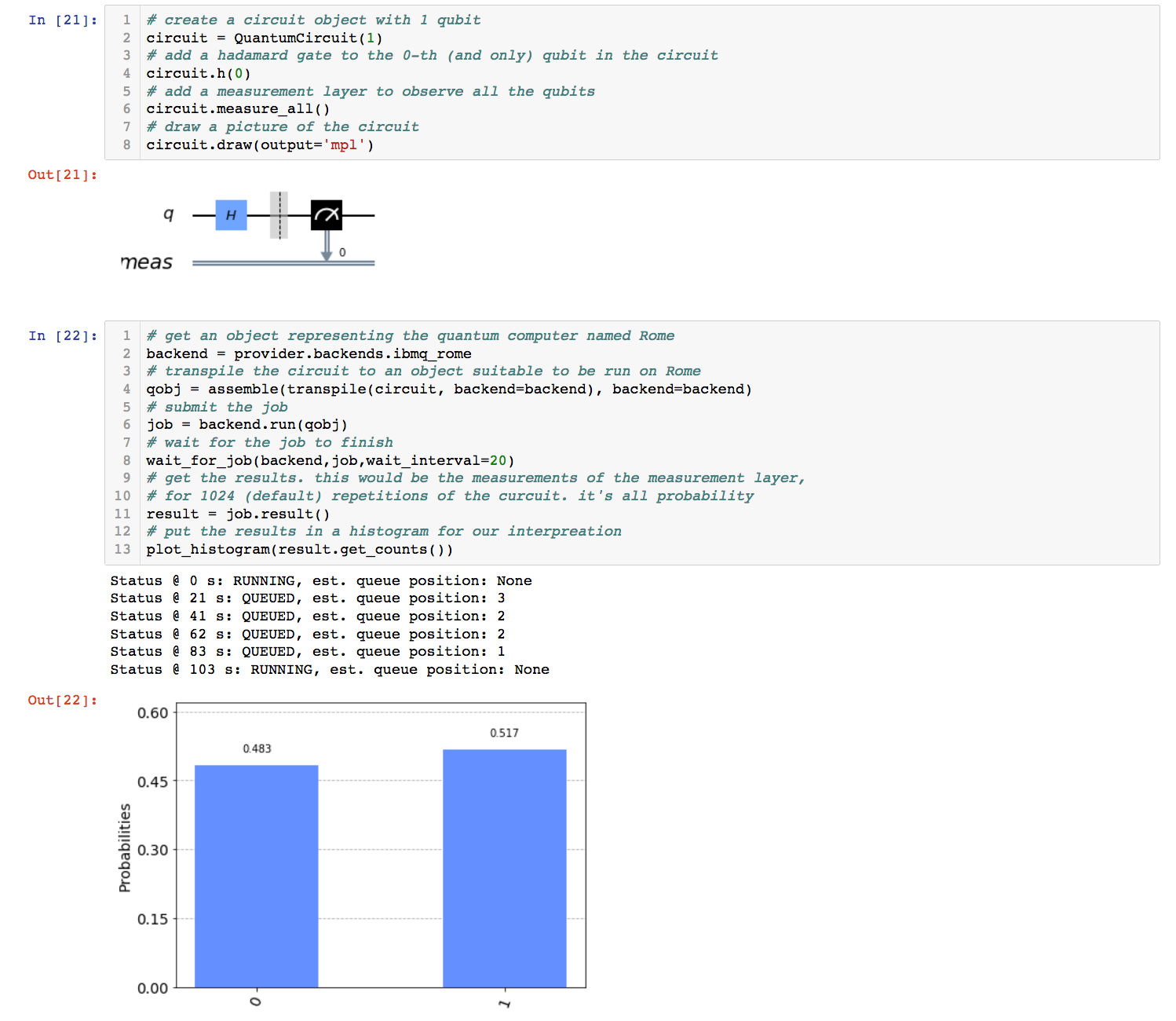 Here is sample Jupyter notebook code that runs our quantum coin flip on the IBM 5 qubit quantum computer named Rome. I give a table of contents of the code.