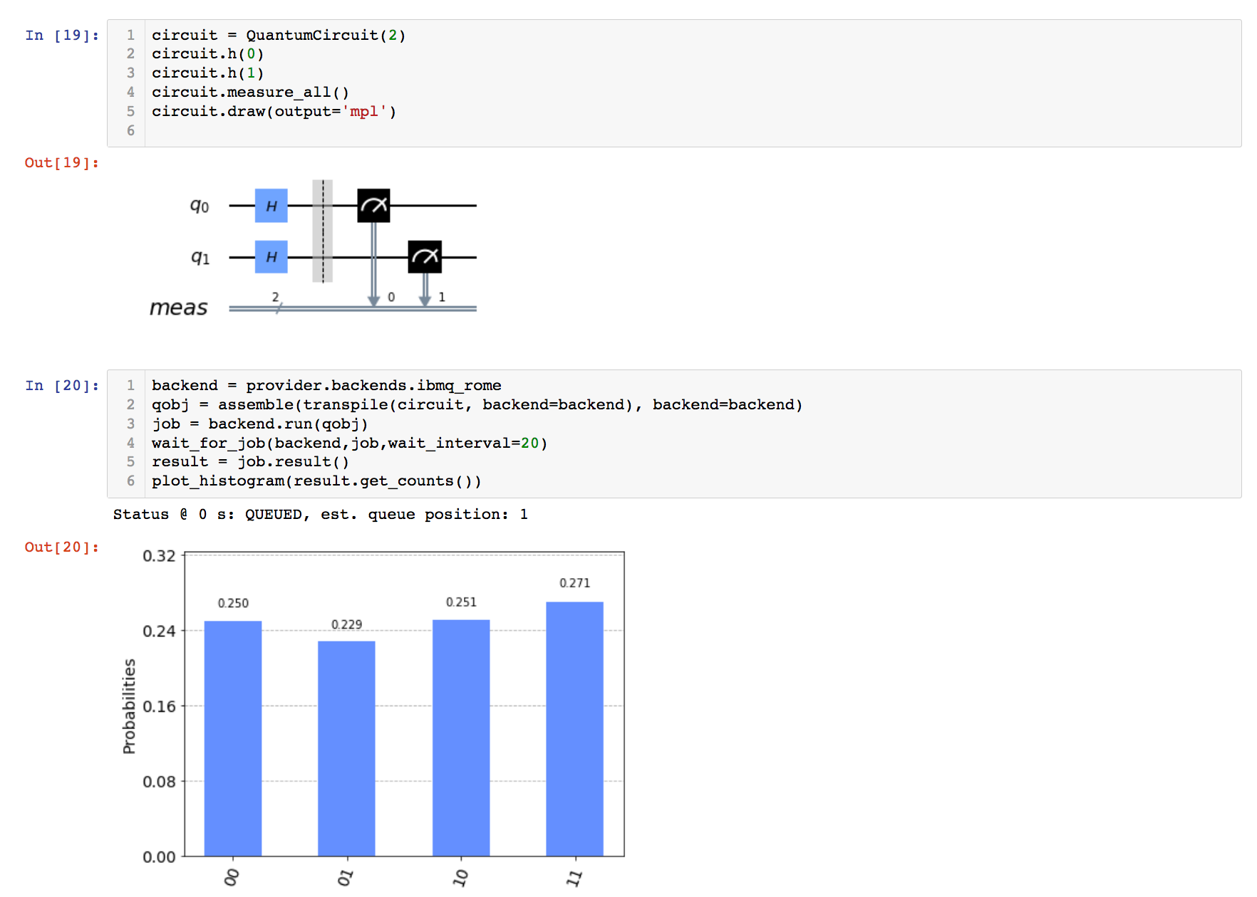 Note the equal weighting of 1/√2 on each state. Recalling Born's rule, a measurement will bring the quantum state to one of these four classical states with probability 1/4. Which is what happend on the quantum computer Rome, as shown in the box above.
