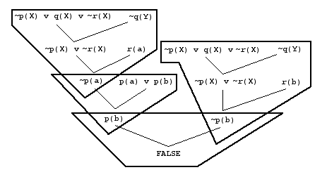 Unit resulting (UR) resolution builds refutations by creating such chunks. The unit clauses used are called electrons, and the single non-unit clause the nucleus. The intermediate clauses of each chunk are not kept, but are instead regenerated, e.g., ~p(X) | r(X) has to be generated twice. UR resolution can be implemented directly in the ANL algorithm by initially placing all unit input clauses into ToBeUsed and the non-units into CanBeUsed. The unit resolvants are placed in ToBeUsed. The first electron of each chunk is the ChosenClause. The nucleus and other electrons are taken from CanBeUsed. There is some loss of effectiveness of subsumption, due to intermediate clauses not being used in subsumption (smart solution - if an intermediate clause subsumes another, replace the other clause with the intermediate clause).