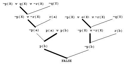 On such a path, it is necessary that at some stage a unit clause or the empty clause must be reached. In the path indicated in the above tree, the first unit clause reached is ~p(a). Starting again towards the root, again a unit or empty clause must be reached, in this case immediately at p(b). So, a unit resolution proof can be broken down into chunks that end with the production of a unit resolvant or the empty clause. In the above proof tree the chunks are :