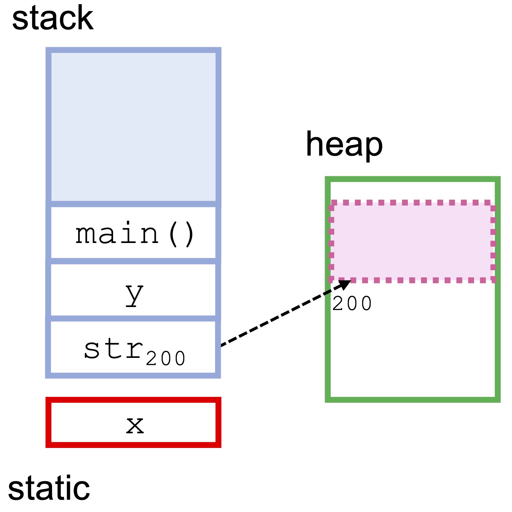The variable x is static storage, because of its global nature. Both y and str are dynamic stack storage which is deallocated when the program ends. The function malloc is used to allocate 100 pieces of of dynamic heap storage, each the size of char, to str. Conversely, the function free, deallocates the memory associated with str.