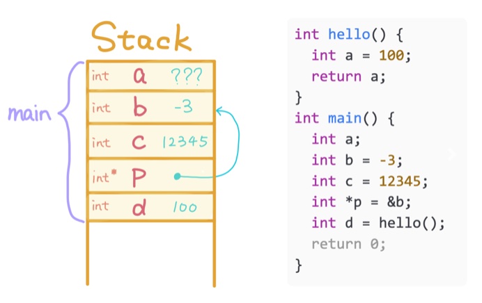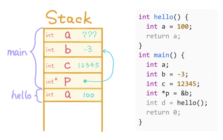 The stack segment is near the top of memory with high address. Every time a function is called, the machine allocates some stack memory for it. When a new local variables is declared, more stack memory is allocated for that function to store the variable. Such allocations make the stack grow downwards. After the function returns, the stack memory of this function is deallocated, which means all local variables become invalid. The allocation and deallocation for stack memory is automatically done.